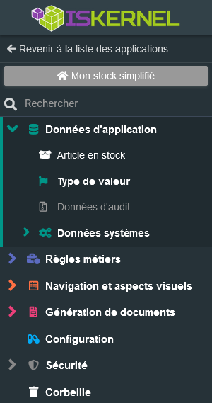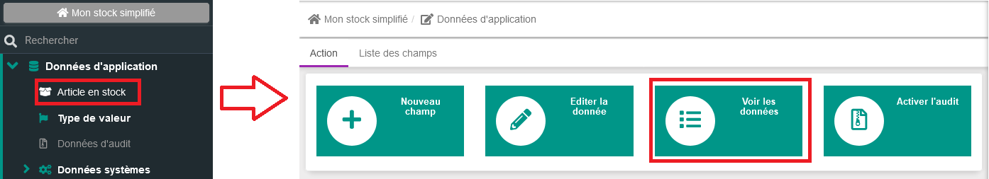 Il est possible, directement dans le DarkOffice applicatif de gérer les données de l'entité fabriquée. Pour ce faire, il faut déplier le menu de gauche pour voir l'entité "Article en stock" et de cliquer l'icone "voir la liste" à droite du nom.