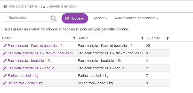 Pour le moment, le modèle est vraiement simple. Avec un peu plus d'expérience, nous pourrions mettre en place une table de référence des articles avec des règles permettant de "découper" un packe de x6 en 6 bouteilles d'eau ou 6 briques de lait, mais pour cette première approche faisons simple. De même, il est "simpliste" de mettre en place une gestion très manuelle des quantités qui demandent de mettre à jour à la main les données directement dans le tableau.