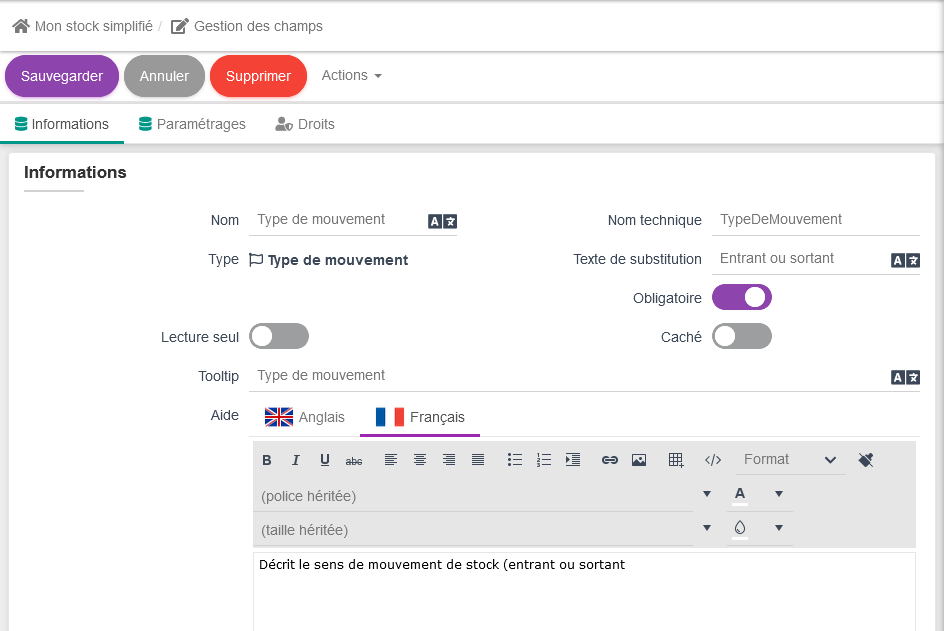 De ce fait, nous allons définir les champs "Article", "Quantité" et "Mouvement de stock".