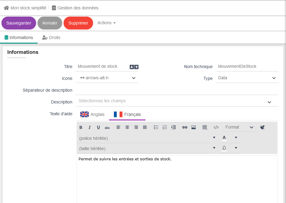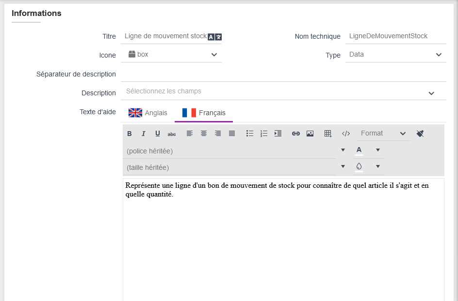 qui sera la base de l'aide disponible dans la documentation en ligne qui sera générée dans l'application. Encore une fois rien d'obligatoire, mais il c'est une bonne pratique de s'astreindre à remplir les textes d'aide le plus tôt possible car cela facilite fortemment la prise en main pour les utilisateurs. Cette aide est multilangue et la liste des langues à remplir dépend du paramétrage global linguistique de la plateforme.