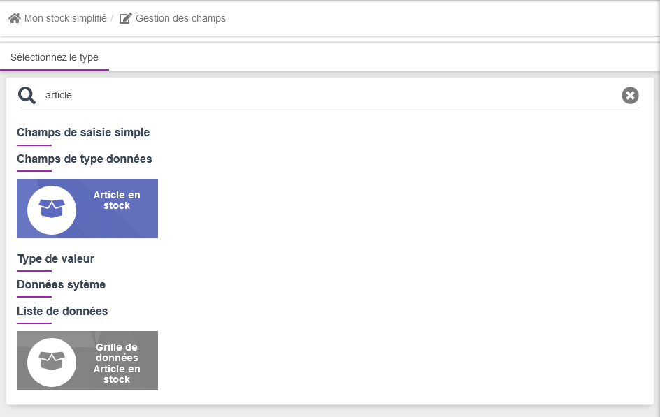 puis sélectionnez le champ "Article en stock"