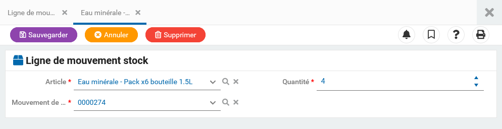 a été automatiquement mis à jour et que le formulaire "Ligne de mouvement de stock" a été créé.