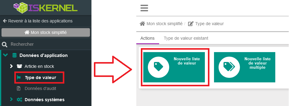 Dans la plateforme ISKernel, une liste déroulante statique (c'est à dire, dont les valeurs ne changent pas lors de l'utilisation) est appelée "Type de valeur". Pour créer cela, il faut cliquer sur le "+" à côté de l'entrée "Type de valeur" du menu de gauche
