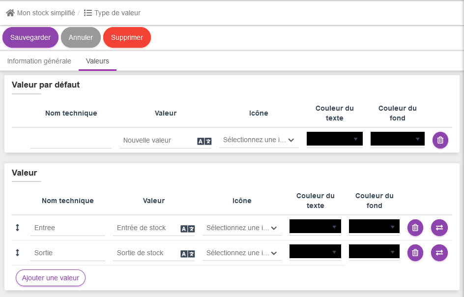 Pour saisir la notion de "Sortie de stock", cliquer sur "Ajouter une valeur" puis dans la ligne créee, entrer les données suivantes