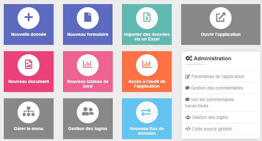 Menu d'adminstration d'une application